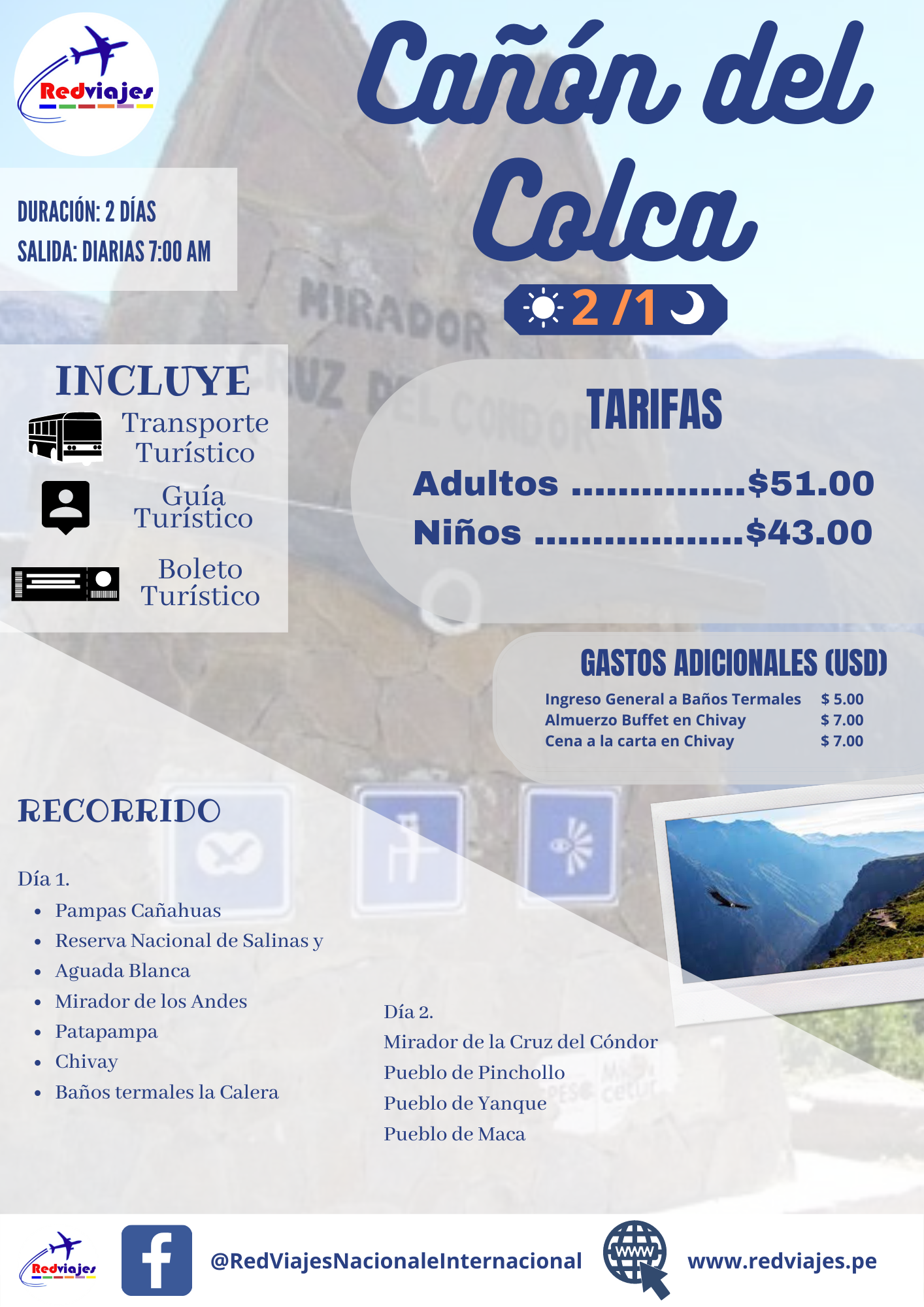 Saldremos hacia el mirador de la CRUZ DEL CÓNDOR, donde podremos observar el vuelo de los cóndores y la profundidad del Cañón del Colca. Permaneceremos en este lugar por aproximadamente 1 hora 30 min y regresaremos visitando pueblos tradicionales como PINCHOLLO, YANQUE y MACA, observaremos lito maquetas, Tumbas Colgates, anfiteatros, iglesias y terrazas. Llegaremos a CHIVAY para el almuerzo y luego retornaremos a la ciudad de Arequipa.